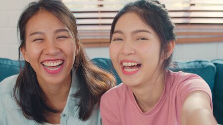 Young Lesbian lgbtq women influencer couple vlog at home. Asian lover female happy relax fun using camera record vlog video upload in social media while lying sofa in living room concept.