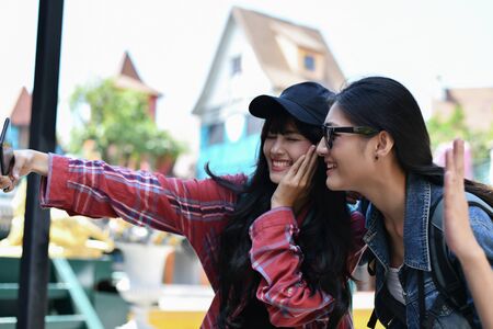 Portrait of a group of asian women friends taking a selfie with a mobile phone together.