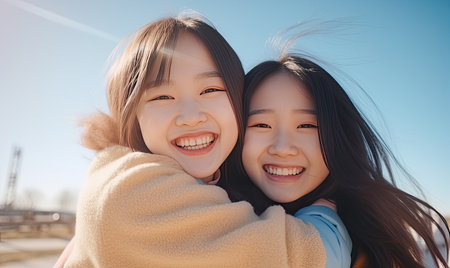 Generative AI : Couple of girls taking a selfie holding a present caucasian and asian people