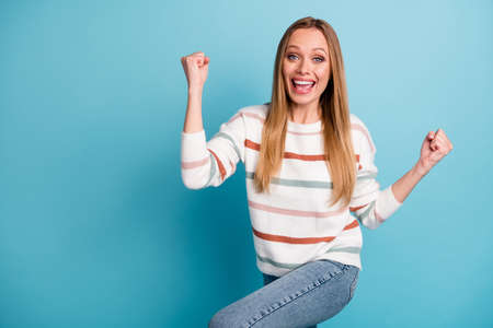 Photo of sweet lucky woman wear striped shirt screaming rising fists isolated yellow color background