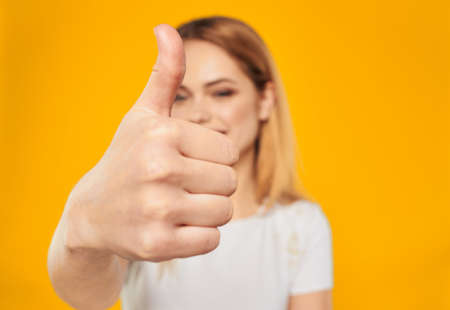 woman's hand with thumbs up gesture in copy space area for advertisement promotion or text on yellow background