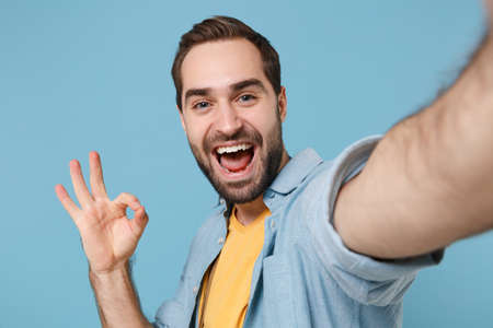 Close up of traveler tourist man in summer clothes isolated on blue background. Male passenger traveling abroad on weekends. Air flight journey. Doing selfie shot on mobile phone, showing OK gesture.