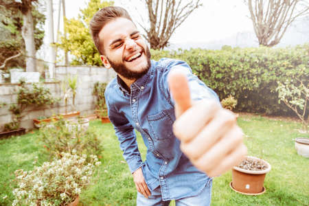 Close up of young guy 20s posing isolated on pastel white wall background studio portrait. People sincere emotions lifestyle concept. Mock up copy space. Showing thumbs up.