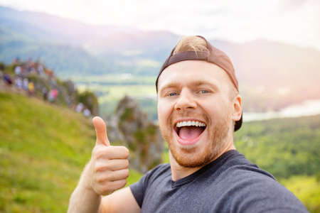 Young happy man traveler make selfie on background of mountains in summer sunset. Concept adventure trip vacation