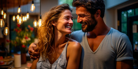 A close-up captures a smiling couple in a warm indoor setting. The image displays a relaxed mood with natural lighting. The composition suggests domestic life with potential use for illustrations and editorial projects. The photograph conveys a feeling of happiness and togetherness.