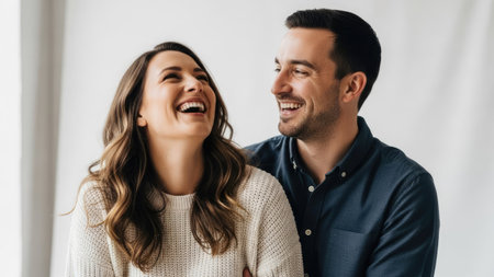 A man and a woman share a hearty laugh, captured in a bright studio environment. The image displays a clean, minimalist style with soft lighting, emphasizing their expressions. This composition could be used for various commercial projects, highlighting themes of happiness and connection.
