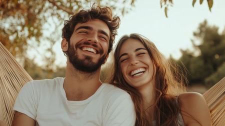 A joyful couple sharing laughter while relaxing in a hammock during a sunny afternoon in a serene outdoor setting