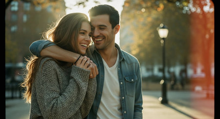 Two smiling individuals share a warm moment, leaning close together and laughing. They are dressed casually and appear to be enjoying each other's company outdoors.