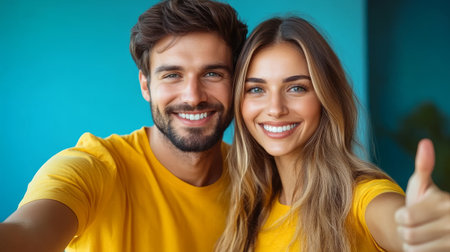 Young couple smiling widely while taking a selfie, showcasing their beautiful teeth and capturing a joyful moment of togetherness