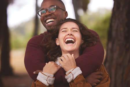 A smiling couple is playfully interacting outdoors, surrounded by foliage. The image displays natural lighting and warm colors creating a positive atmosphere. It may be suitable for use in articles, advertising, or visual content highlighting relationships and shared experiences.