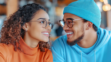 Intimate moment of a smiling young couple in an indoor setting depicts modern love and casual lifestyle. A.I.