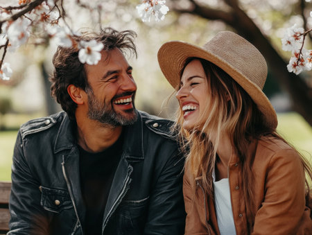 A couple is captured in a candid moment, sharing laughter on a park bench under blooming trees, embodying joy and lightheartedness on a sunny spring day.