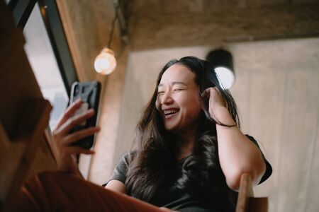 Portrait of a lovely asian couple having good time and taking a selfie with mobile phone in coffee shop.