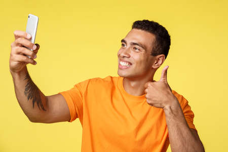 Guy record video feedback about product, give recommendation. Attractive young man with tattoo, hold smartphone, take selfie or make vlog, show thumb-up gesture, smile pleased, satisfied with holiday