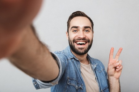 Brunette man showing peace sign and taking selfie on cellphone isolated over grey background