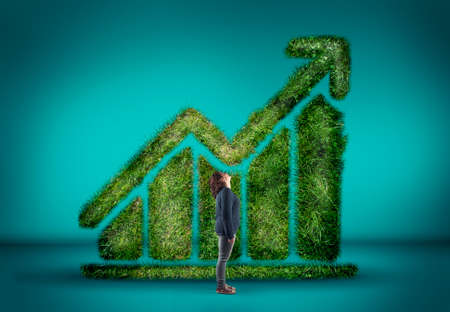 Young woman looks up to a graph made of grass on a simple blue background. The concept of natural growth and improvement.