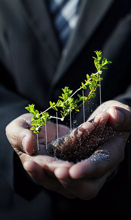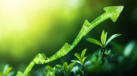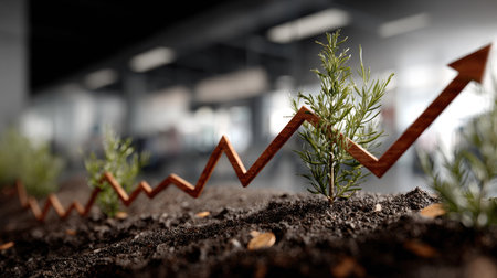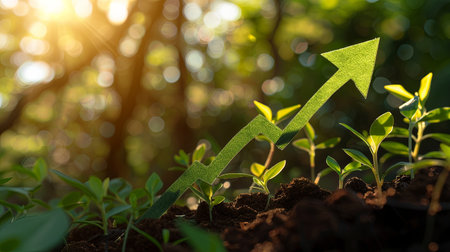 This conceptual image depicts the relationship between nature and business growth, featuring plants and an upward arrow on soil, symbolizing prosperity and success.