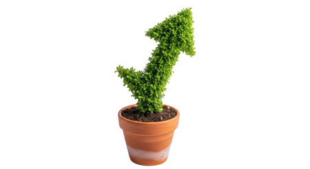 A lush green plant shaped like an upward-pointing arrow sits in a terracotta pot, symbolizing growth, success, and positive financial trends on a white backdrop.