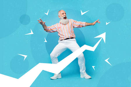 Photo cartoon comics sketch picture of cheerful good mood senior guy dancing achieving goals isolated blue painted background