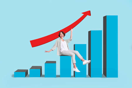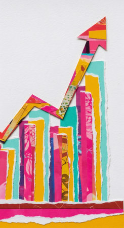 Colorful collage bar graph with an upward arrow. Visual representation of growth, success, and positive trend for business and finance concept.