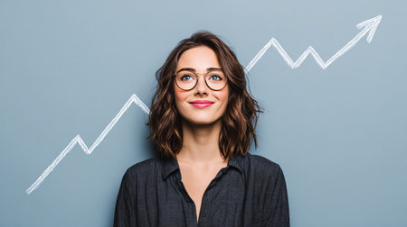 smiling young businesswoman in eyeglasses looking at camera while standing with growth chart isolated on grey