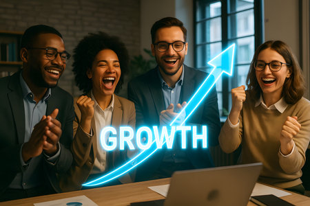 A diverse group of cheerful business professionals joyfully celebrates significant financial growth and success, symbolized by a glowing upward arrow and the word 'GROWTH'. The team is seen in a modern office setting, expressing excitement and achievement after reviewing positive results on a laptop. This image perfectly illustrates concepts of business development, teamwork, positive outcomes, financial progress, and successful strategy.