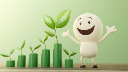 A cheerful cartoon figure excitedly points to a plant growing on a business chart, symbolizing financial and environmental progress, perfect for marketing themes.
