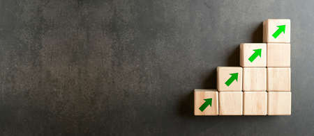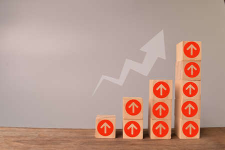 Top view wooden blocks set to growth graph with up arrow. Concept for money and success business.