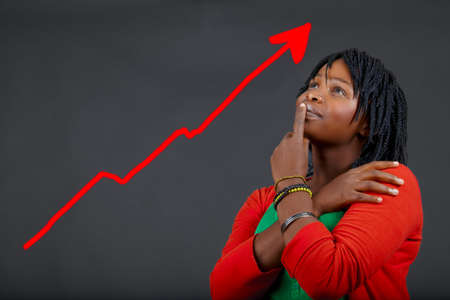 Graph chart growing up in the hand. Success is in your hands. Red arrow up in a woman's hand on a blue background. Price increase
