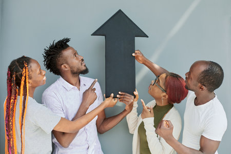 Illustrated image features three smiling people carrying a large, green upward arrow. They are dressed in pastel colors, on a light yellow background.