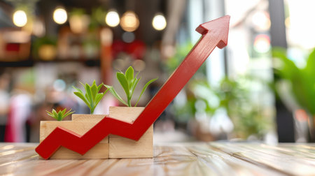 This image features a red arrow symbolizing growth alongside thriving green plants in a vibrant business setting, representing success and development.