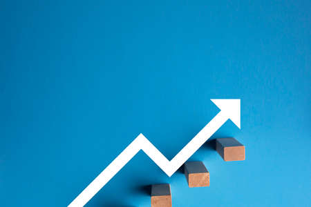 wooden cubes arranges as progress and success in investment with arrow on blue background, business concept