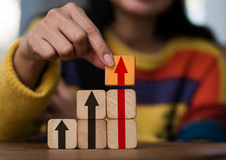 Hand putting up arrow which print screen on wooden cube block for business and sale growth concept.
