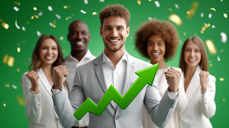 Group of professionals displaying excitement with fists raised in celebration of goals achieved. Bright green backdrop adds energy and positivity. Concept of finance, teamwork, corporate success.