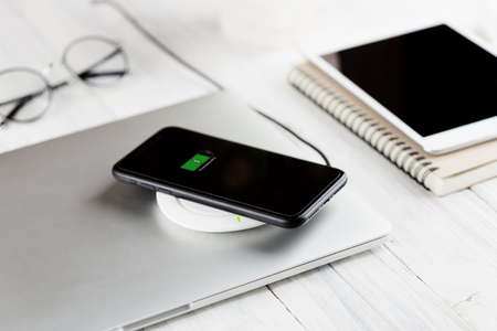 Charging the smartphone with wireless charger on wooden desk. Modern lifestyle concept.