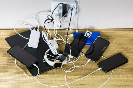 Wireless devices charge in same time from the wall power outlet with a power adapter and from couple power banks