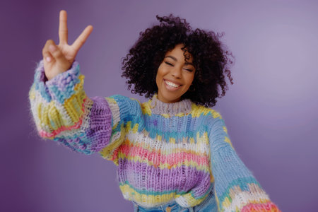 Beautiful woman shows the peace sign isolated on a pastel background.