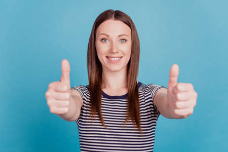 Portrait of charming cheerful cute adorable lady raise thumb up reliable agreement on blue background