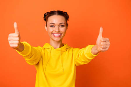 Portrait of lovely youth showing thumbs up smiling wear hoodie jumper isolated over orange background