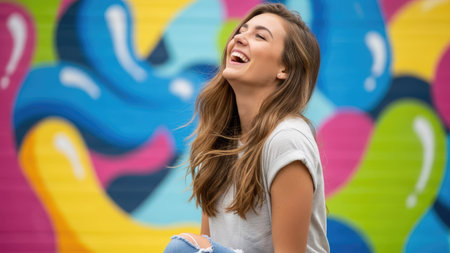 A woman laughs with eyes closed against a bright backdrop. Her long hair flows. The background features a blurred, colorful design, with blue, yellow, and pink hues. The image has a natural lighting. Suitable for various editorial and commercial applications.