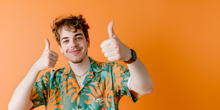 A cheerful young woman with long hair is smiling broadly, giving two thumbs up against a light background. Her vibrant tank top featuring palm trees adds a playful touch, embodying a carefree summer spirit and positivity.