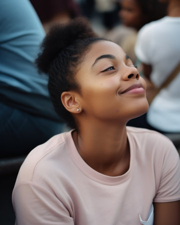 Yeah feeling cool and awesome Excited happy young African American woman lifts mood from loud music shows rock n roll gesture glad to visit concert of favourite band excl : Generative AI
