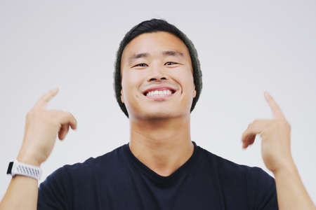 Happy asian man arm up with successful achievement while standing over isolated grey background with copy space for text, banner