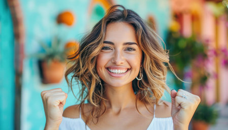 In the image, a joyful woman is confidently raising her fist in the air, displaying happiness and selfassurance