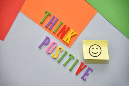 Colorful THINK POSITIVE text on the red, orange and green background. Smile icon on the sticky note. Lifestyle concept.