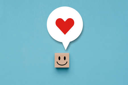 Wooden cube with happy face with a happy in thought in its head, wood block with a emotion smile face and love in thoughts