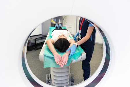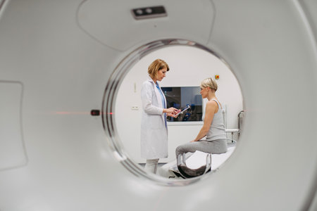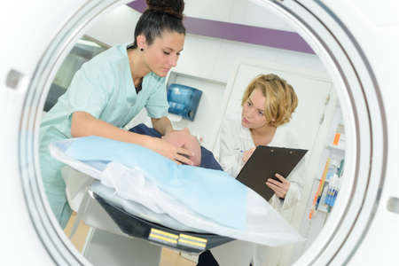 Doctor or nurse and patient with tomography CT or MRI Scan in hospital. Interior of radiography department. Technologically advanced equipment in white room. Magnetic resonance diagnostics machine