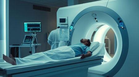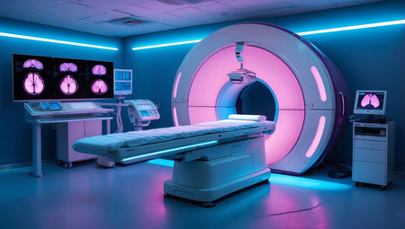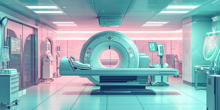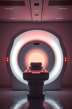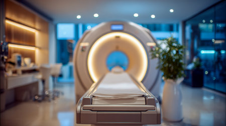 A sleek, well-lit diagnostic space with a cutting-edge mri machine, minimalist decor, and a calming atmosphere designed for patient comfort and precision imaging.