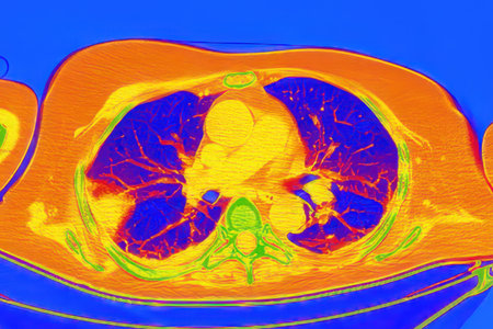 Human lungs with COVID-19 pneumonia, color-enhanced CT scan showing normal lung tissue in dark blue and affected bilateral areas with ground-glass opacities and crazy-paving patterns in red.