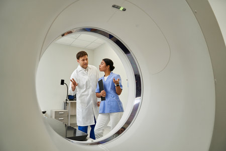 Two doctors in white coats discuss an MRI scanner machine in a modern healthcare facility, showcasing teamwork.